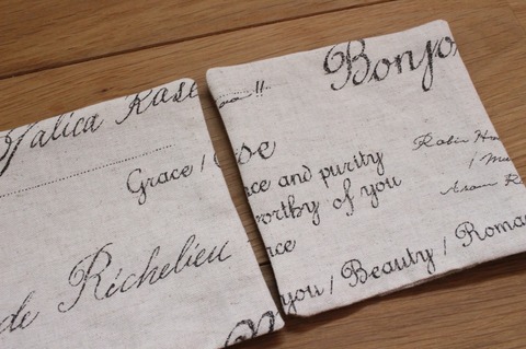 コースターによさそうなサイズのリネンハギレがありましたので、いろんな筆致で描かれたYUWAの英字柄の綿麻生地と合わせて、コースターを作りました。