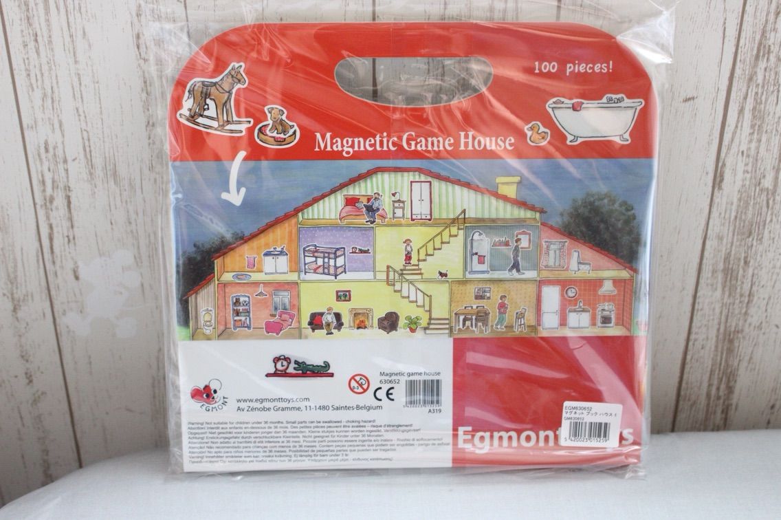 家の中にありそうないろんなもの(家具や人、ペット、家電、食器、雑貨など)がすべてマグネットのパーツになっていて、台紙の家の中に好きなように配置して遊べる、インテリア遊びのできるマグネットブックなんです。
