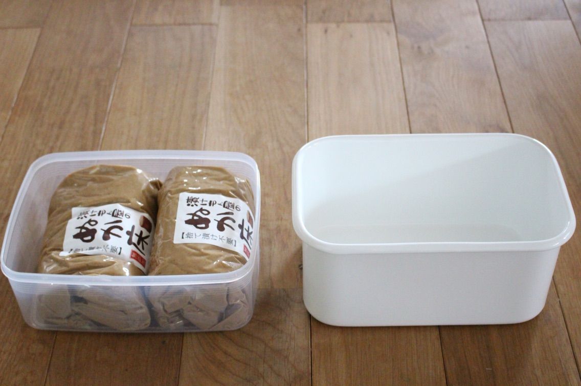 琺瑯の方が高さがあり、以前購入したレクタングル深型LLとほぼ同サイズで、冷蔵庫内ではかさばりそうだなと思い、ぬか床のお店のタッパーでまずは始めてみることにしました。